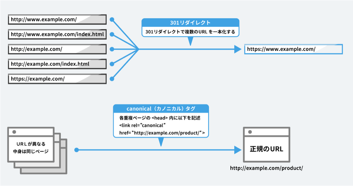 「URL正規化」とは、同じコンテンツのページが複数存在する場合、どの1ページを検索エンジンに評価してもらうかを統一する施策です。「URL正規化」は、301リダイレクトやcanonicalタグを利用することで解決できます。