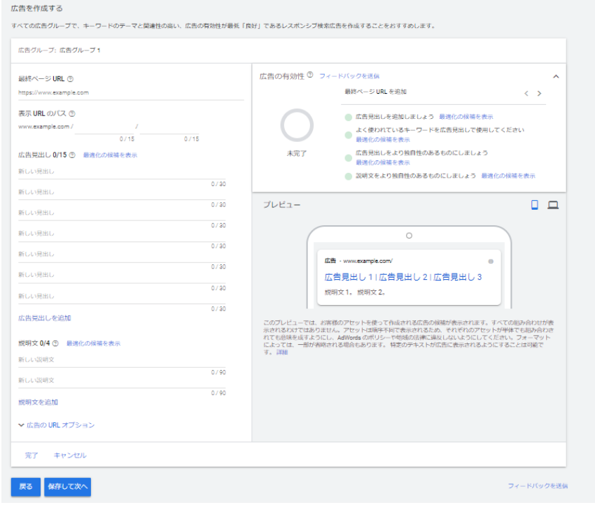 配信条件が設定できたら、広告見出し、リンク先URL、説明文などを入力して、実際に広告を作成していきます。
