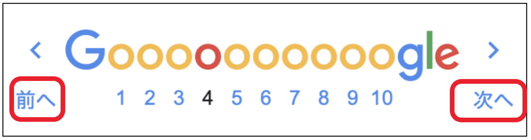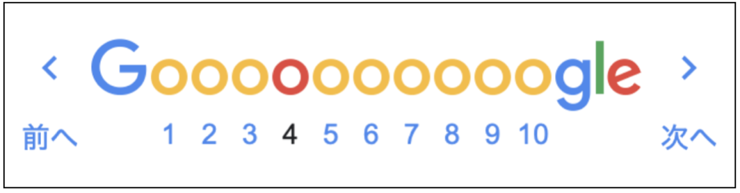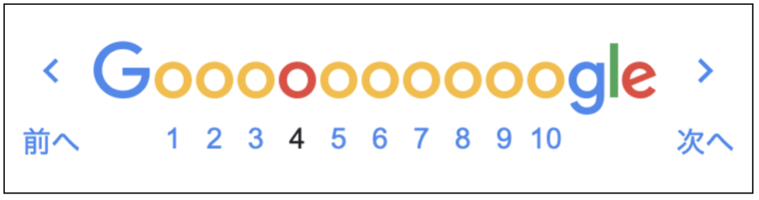 たとえば、上記の画像では、4ページ目を表す「4」という数字が黒色で表現されていたり、「Google」の「o」の4番目の文字が赤く色付けられたりしています。このように、ちょっとした工夫で現在閲覧しているページが何ページ目であるかを示し、ユーザーの利便性が高まります。