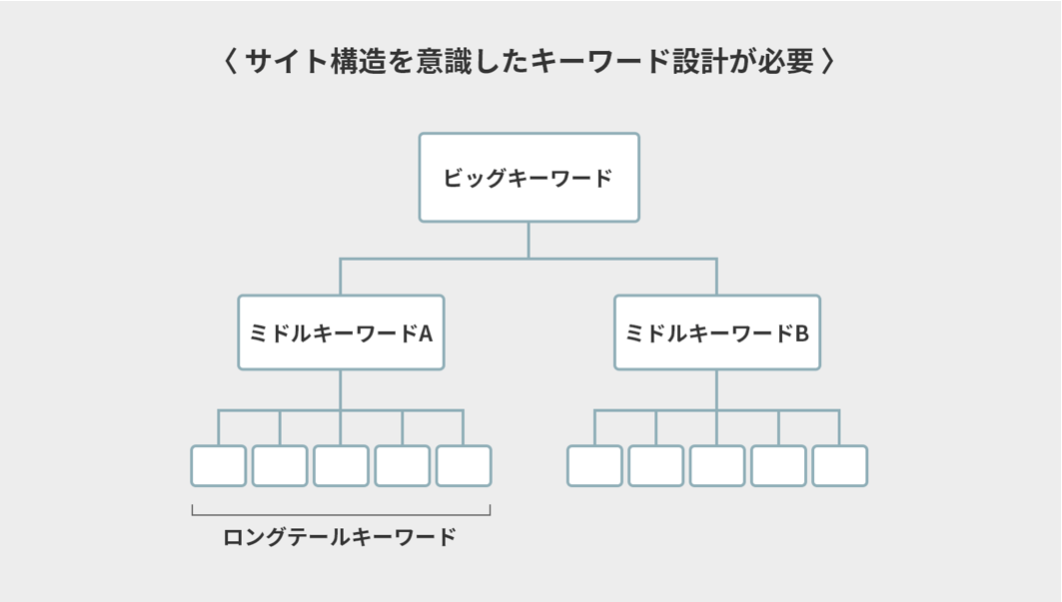 最後にサイト構造を見直し、正式に決定します。ここまでで出してきたビッグキーワードやミドルキーワード、ロングテールキーワードをディレクトリ構造の観点から整理しましょう。キーワードを整理する際には、「1コンテンツ=1キーワード」を基本とするのがポイントです。メインキーワードやビッグキーワードは最上階層、ミドルキーワードは中間階層、ロングキーワードは最下層と当てはめて分類しましょう。