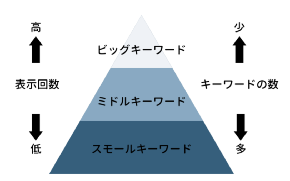 ビッグワードの対極にあたる検索ボリュームの少ないキーワードをスモールワードと言います。スモールワードは、検索ボリュームの目安が10~200程度のキーワードを指し、3語以上からなる複合キーワードである場合が多いです。