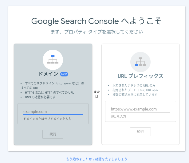 Google Search Consoleにアクセスしたら、Webサイトの所有権を確認する方法を選択するためのプロパティタイプの選択が表示されます。所有しているWebサイトのタイプに応じて、以下のいずれかの方法を選択します。