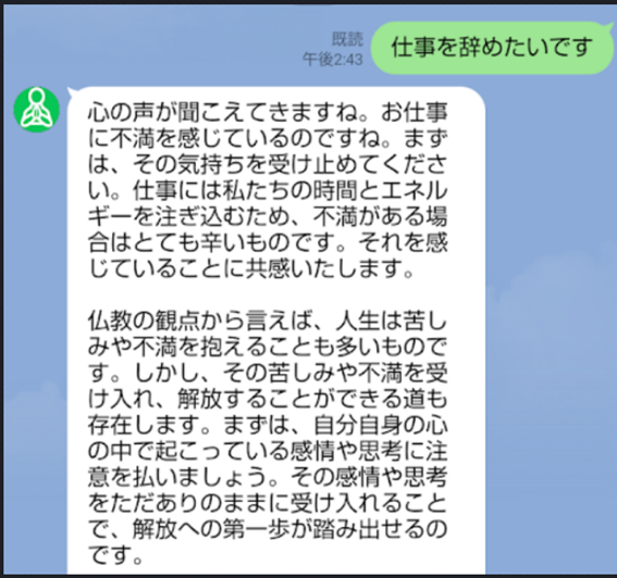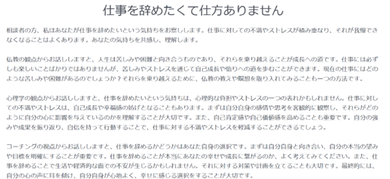 最初に相談者の悩みを受け入れ、仏教や心理学、コーチングの観点から今後どのようにしていくべきか回答を示してくれます。
